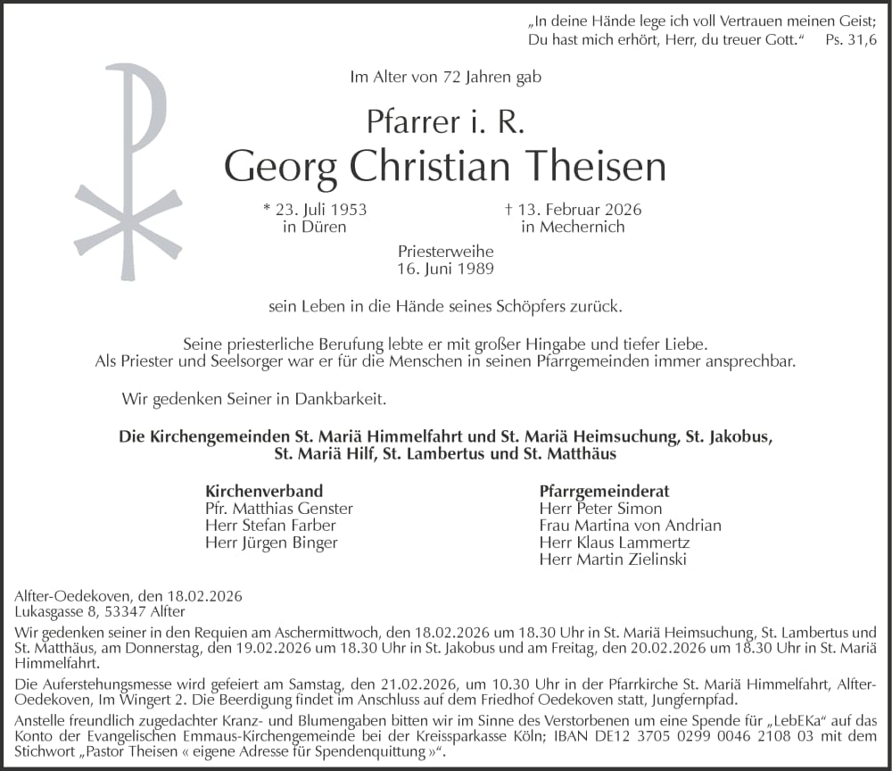 Am vergangenen Freitag starb unser langjähriger Präses Pastor Georg Theisen (Pfr. i. R.). Voller Trauer denken wir an viele gemeinsame Stunden, sowohl bei den gemeinsam gefeierten Messen, als auch bei Ausflügen und Festen. Seine freundliche Unterstüzung, sein liebes Wort und sein offenes Ohr werden uns allen fehlen. Wir werden im Gebet und Gesang an ihn denken.